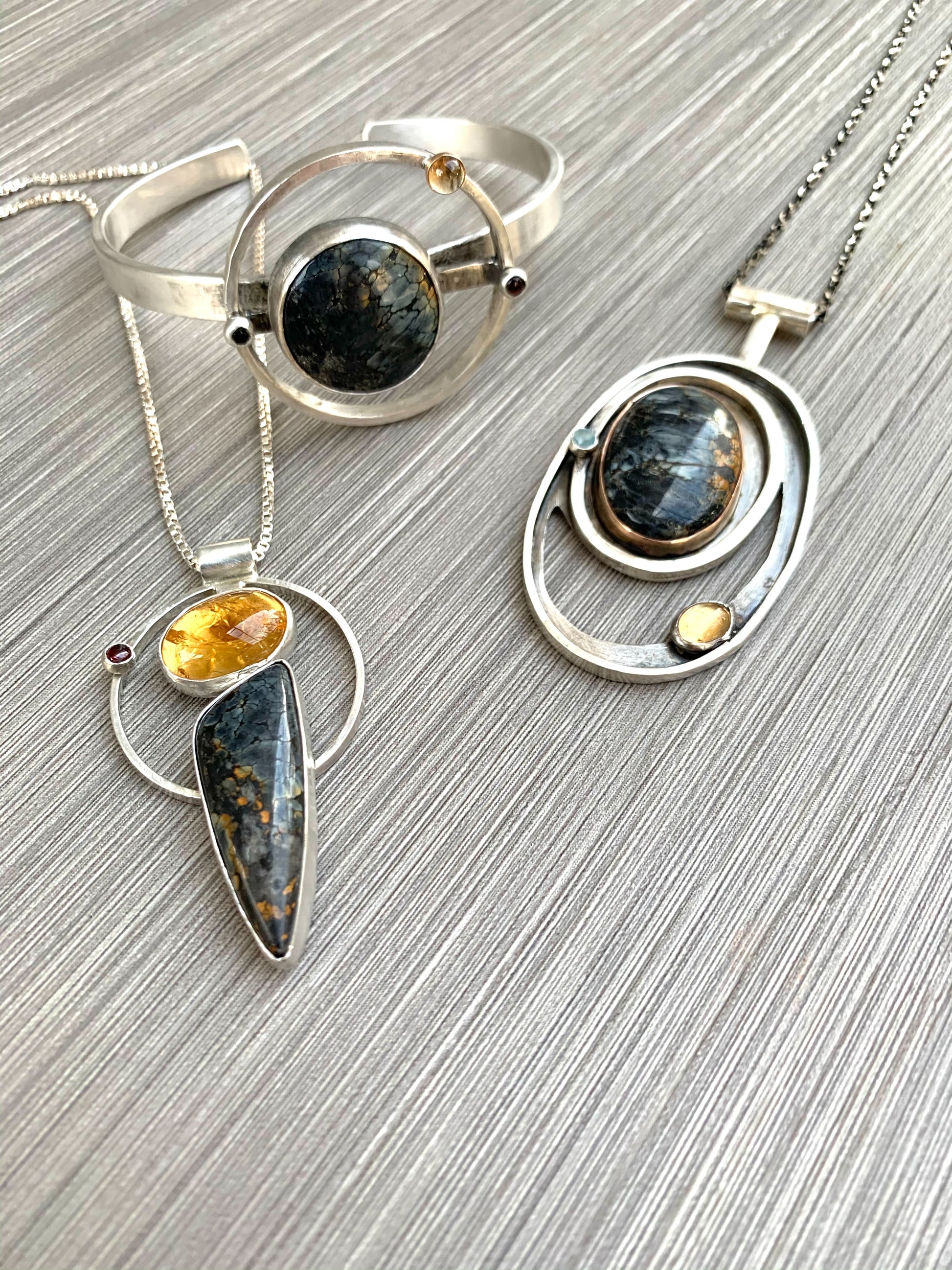 Orbite Elliptique Is Focused Around A Mysterious Silver Peak Of Dark Hues And A Hint Of Warm Gold Accented In A Gold Fill Bezel. An Orbit Ring With A 3mm Aquamarine Satellite. Encompassed By The Larger Ellipse With A Citrine Satellite.